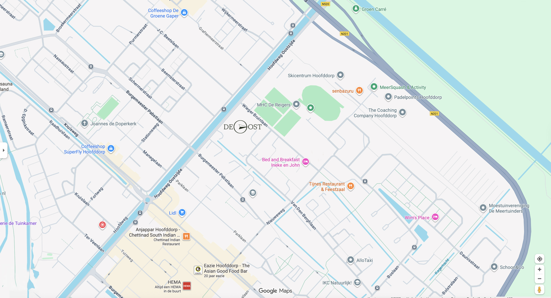 De Oost ligt op een mooie locatie aan het binnenwater en op nog geen 8 minuten lopen van het centrum van Hoofddorp. Met 5 minuten rijden bent u bij alle belangrijke uitvalswegen naar Amsterdam, Den Haag en Schiphol.